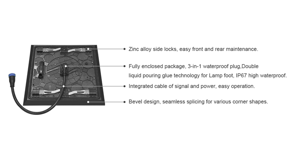 Rock Plus Series - 100% Waterproof 960 * 960mm Outdoor Front Service Pixel Pitch(mm) 5.33 P6.67 P8 P10 Pixel Density(dots/㎡) 35156 22500 15625 10000 Brightness(cd/㎡) 5500cd 5500cd 5500cd 6000cd LED Lamp 1921 SMD2727 Cabinet Size(mm) 960 * 960 or customized Module Size(mm) 320 * 320 Module Resolution(dots) 60*60 48*48 40*40 32*32 Viewing Distance(m) ≧5m ≧6m ≧8m ≧10m Scan 1/6 scan 1/6 scan 1/4 scan 1/2 scan Module Maximum Power(W) 54W 54W 54W 54W Power distribution(W/cabinet) 570w 570w 570w 570w Actual Max.Power Consumption (W/cabinet) 500w 500w 500w 500w Average Power Consumption (W/cabinet) 200w 200w 200w 200w Die-casting aluminum Cabinet Weight (KG/cabinet) 25 25 25 25 Iron Cabinet Weight(KG/cabinet) 46KG 46KG 50kg 50kg Cabinet Sharing Universal cabinet for all above pixels Angle Splicing Support Cabinet Material Profile Aluminium Pixel Composition 1R1G1B Operating Input Voltage(V) Separate power supply for red and green/blue lights,R:2.8V, GB:3.8V(Mainly 3.8V) Gray Scale ≧14bits Brightness Adjustment 0~255 Refresh Rate Constant Current IC 1920/High Brush IC 3840 Refresh Frame Frenquncy 60Hz Maintenance Front/Rear Cabinet IP IP65 Module IP Front IP67 & Back IP65 Continuous Use Time >72h Life Span 100,000h MTBF >10,000h Blind Spot Rate <0.01% Operating Temperature -20℃~+50℃(Below -20 degrees could be customized) Operating Humidity Outdoor 10%~90%